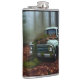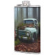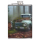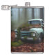 Awesome hip flask for vintage truck lovers features an AI generated digital art painting of an abandoned vintage blue truck in a forest, now covered with moss and leaves. Perfect gift idea for truck lovers!