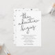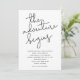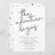Modern and simple wedding invitation card featuring a hand lettered typography text that says "the adventure begins." This black and white design is perfect for minimalists!
