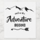 The Adventure Begins Trendy Wine Label. Our handmade mountain with modern fonts and our handmade arrow surround the positive quote "and so the adventure begins".