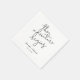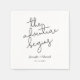 Modern wedding napkin featuring a script text hand written that says "the adventure begins" in black and white. This typography design is minimalistic and works for any season. Customise this product by adding the couple's names and event date.
