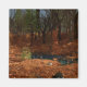 A secluded dell on a autumn afternoon, perfect for a quiet walk through the woods. The warm setting sun lights the fallen leaves and a small pool. A bluebird couple looks for food amid the leaves and pine cones.