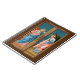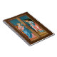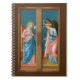 “℣. The Angel of the Lord declared unto Mary, ℟. And she conceived of the Holy Spirit.” Thus, begins the Angelus the Church’s thrice-daily prayer to the Blessed Virgin Mary (BVM) that commemorates the Incarnation at the Annunciation. + The Annunciation was an immensely popular subject in the art of the Middle Ages and the Renaissance. As a two-person composition, the subject lent itself to use on the outer leaves of triptychs: the angel on one leaf; Mary, on the other. A triptych is an artwork—most often a panel painting—that is comprised of three parts hinged together in such a way that it can be displayed open or folded shut. + Here, Filippo Lippi (1406-1469) has painted the Annunciation in tempera on wood in warm pinks, salmons, and reds and in both brilliant and dark blues. Both figures stand in their narrow respective spaces, the Archangel Gabriel bowing slightly to the gentle and sweetly featured Maiden Mary. + Saints_Aplenty likes a dark brown background for this image. A dark brown background gives viewers the impression that they are onlookers observing the scene through a window. But, as per usual, we have provided a Colour Palette postcard for other suggested hues. + Feast of the Annunciation: March 25; Feast of St. Gabriel the Archangel: September 29 + Image Credit (M 038): Antique image of The Annunciation by Filippo Lippi (1406-1469) from a late 19th-early 20th-century postcard in chromolithography, originally published by E. Sborgi, Florence, Italy, from the designer’s private collection of religious ephemera. The original panels from a polyptych of unknown origin are in the Filippo and Filippino Room of the Uffizi Gallery in Florence. The Annunciation forms the upper halves of the two leaves while SS. Anthony Abbott and John the Baptist appear on the lower left and lower right, respectively.