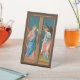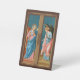 “℣. The Angel of the Lord declared unto Mary, ℟. And she conceived of the Holy Spirit.” Thus, begins the Angelus the Church’s thrice-daily prayer to the Blessed Virgin Mary (BVM) that commemorates the Incarnation at the Annunciation. + The Annunciation was an immensely popular subject in the art of the Middle Ages and the Renaissance. As a two-person composition, the subject lent itself to use on the outer leaves of triptychs: the angel on one leaf; Mary, on the other. A triptych is an artwork—most often a panel painting—that is comprised of three parts hinged together in such a way that it can be displayed open or folded shut. + Here, Filippo Lippi (1406-1469) has painted the Annunciation in tempera on wood in warm pinks, salmons, and reds and in both brilliant and dark blues. Both figures stand in their narrow respective spaces, the Archangel Gabriel bowing slightly to the gentle and sweetly featured Maiden Mary. + Saints_Aplenty likes a dark brown background for this image. A dark brown background gives viewers the impression that they are onlookers observing the scene through a window. But, as per usual, we have provided a Colour Palette postcard for other suggested hues. + Feast of the Annunciation: March 25; Feast of St. Gabriel the Archangel: September 29 + Image Credit (M 038): Antique image of The Annunciation by Filippo Lippi (1406-1469) from a late 19th-early 20th-century postcard in chromolithography, originally published by E. Sborgi, Florence, Italy, from the designer’s private collection of religious ephemera. The original panels from a polyptych of unknown origin are in the Filippo and Filippino Room of the Uffizi Gallery in Florence. The Annunciation forms the upper halves of the two leaves while SS. Anthony Abbott and John the Baptist appear on the lower left and lower right, respectively.