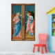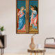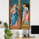 “℣. The Angel of the Lord declared unto Mary, ℟. And she conceived of the Holy Spirit.” Thus, begins the Angelus the Church’s thrice-daily prayer to the Blessed Virgin Mary (BVM) that commemorates the Incarnation at the Annunciation. + The Annunciation was an immensely popular subject in the art of the Middle Ages and the Renaissance. As a two-person composition, the subject lent itself to use on the outer leaves of triptychs: the angel on one leaf; Mary, on the other. A triptych is an artwork—most often a panel painting—that is comprised of three parts hinged together in such a way that it can be displayed open or folded shut. + Here, Filippo Lippi (1406-1469) has painted the Annunciation in tempera on wood in warm pinks, salmons, and reds and in both brilliant and dark blues. Both figures stand in their narrow respective spaces, the Archangel Gabriel bowing slightly to the gentle and sweetly featured Maiden Mary. + Saints_Aplenty likes a dark brown background for this image. A dark brown background gives viewers the impression that they are onlookers observing the scene through a window. But, as per usual, we have provided a Colour Palette postcard for other suggested hues. + Feast of the Annunciation: March 25; Feast of St. Gabriel the Archangel: September 29 + Image Credit (M 038): Antique image of The Annunciation by Filippo Lippi (1406-1469) from a late 19th-early 20th-century postcard in chromolithography, originally published by E. Sborgi, Florence, Italy, from the designer’s private collection of religious ephemera. The original panels from a polyptych of unknown origin are in the Filippo and Filippino Room of the Uffizi Gallery in Florence. The Annunciation forms the upper halves of the two leaves while SS. Anthony Abbott and John the Baptist appear on the lower left and lower right, respectively.