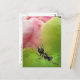 This postcard features a classic symbiotic relationship. A tiny ant is crawling on a peony bud to get the sweet sticky sap. It is believed that this activity causes the bud to open into a gorgeous pink flower. This view into a very small world is displayed as a lovely abstract in pink, green and black.