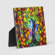 Colourful tabletop art created with AI software features a surreal stained glass apple tree with green and gold leaves, and red apples, that create a frame as well.