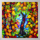Colorful digital art painting created with AI software features a surreal stained glass apple tree with green and gold leaves, and red apples, that create a frame as well.