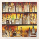 Bar art coasters featuring an artistic depiction of liquor and spirits bottles arranged on shelves for the back bar of an establishment. Digital watercolor created using AI generating software.