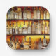 Bar art paper party plates featuring an artistic depiction of liquor and spirits bottles arranged on shelves for the back bar of an establishment.  Digital watercolor created using AI generating software.  Perfect for 21st birthday parties, bachelor parties and more.