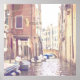 This digital poster features a view of Venice Italy that not many tourists get to see. It is a glimpse into the everyday life of the backstreets of this famous European travel destination and done in the style of a vintage travel poster with the city name in a fancy open face faded brown font.