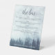 This tabletop sign is a great way to let your guests know the bar menu at your wedding reception. It features a rustic yet elegant design with a mountain landscape of a forest of blue spruce or pine trees shrouded in mist or fog. The title is written in elegant script calligraphy and reads: The Bar. There is space for your drinks menu as well as the names of the couple and wedding date. Perfect for an outdoor or alpine destination reception.