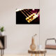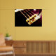The original abstract photograph on this Art Poster focuses on the base of an electric bass guitar, the part where the strings begin and rise all the way up to the neck. The closeup photo coloration is done in rich, deep warm browns with a golden light on the metal plate, strings, screws and springs.