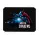 Batman character art, featuring the Batmobile driving over a bridge and the text: "I Am The Shadows".