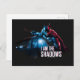 Batman character art, featuring the Batmobile driving over a bridge and the text: "I Am The Shadows".