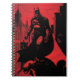 Comic book style illustration of Batman standing atop a gargoyle in Gotham City.