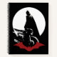 Batman standing in silhouette by the Batcycle with Bat Logo.