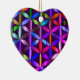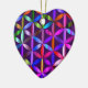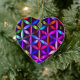 The Flower of Life symbol, in purple tones, is on the front and on the back of a heart-shaped ceramic Valentine tree ornament.