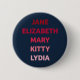 Button featuring the names of the Bennet sisters in different shades of pink from Pride and Prejudice by Jane Austen: Jane, Elizabeth, Mary, Kitty and Lydia. Great button for book lovers and fans of Jane Austen.
