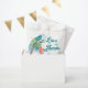 The big one 1st birthday surfing retro beach party thank you favour bag template. A big blue wave, palm tree and a surf board, lovely summer, beach birthday party theme.