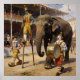 Performers parade through a circus with clowns, stilts, and a majestic elephant. The scene is lively with colorful costumes and an audience watching.
