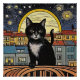 A.I .created print of a starry, moonlit night sky features a black cat in the foreground, set against a landscape of quaint village buildings and colorful houses.