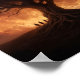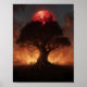 Beneath a sky ablaze with fire and shadow, a colossal tree stretches its roots deep into the earth as if anchoring reality itself. Above its crown looms a blood-red moon, casting an ominous glow that paints the heavens in crimson. Figures gather at the tree’s base, their silhouettes small against its vast, gnarled form, as if drawn to witness an ancient rite or a world-ending omen. The scene feels both eternal and apocalyptic—an image of creation, destruction, and the fragile bond between mortals and the cosmos.