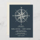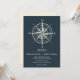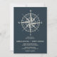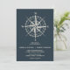 Nautical chic wedding invitation features a vintage style hand drawn compass illustration in beige colour on navy blue background