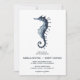 Nautical chic wedding invitation features a vintage style hand drawn seahorse watercolor illustration in navy blue.