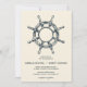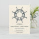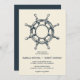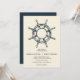 Nautical chic wedding invitation features a vintage style hand drawn ship's wheel illustration in beige colour on navy blue background