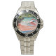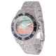 Has heft and feel of expensive stainless steel quartz watches. Good band with safety catch. I removed links, which is easy because engraved arrows show direction to push the linking pins. As always by this seller, the image (a railroad logo) is a perfect reproduction of my emailed image, and is precisely spaced and aligned.