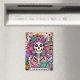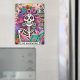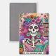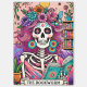 Vibrant, colourful design featuring a funny tarot card with a female skeleton. The skeleton has wild pink hair with flowers in it, a sugar skull face, and is holding a open book. The colourful text reads: "The bookworm". This design is available on a wide variety of products.