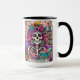 Vibrant, colourful design featuring a funny tarot card with a female skeleton. The skeleton has wild pink hair with flowers in it, a sugar skull face, and is holding a open book. The colourful text reads: "The bookworm". This design is available on a wide variety of products.