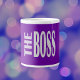 THE BOSS - BOLD TYPOGRAPHY DESIGN in purple and light colours . Great gift for any real or wannabe boss in your life . Funny jumbo mug by Alma Wad .