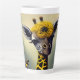 Cute latte mug features AI generated surreal digital art painting of a whimsical giraffe morphed with a bumblebee.