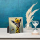 Tabletop art plaque features AI generated surreal painting of a whimsical giraffe morphed with a bumblebee.