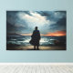 Before a restless sea and a dramatic sky, a solitary figure gazes at the unknown. The twilight glow suggests hope, while the boat on the shore invites a journey.
