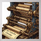 An exceptionally detailed illustration of a 19th-century newspaper printing press ("The Camelot Circular") in action. The focus is on a macro section of the gears, rollers, and paper feed mechanism, highlighting the intricate industrial workings and the fine-line detail of the mechanical assembly.