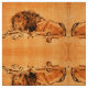 An extinct berber lion crouching,resting, pen and ink drawing from Dutch painter Rembrant Van Rijn late 1640s. Classic design in vibrant yellow orange brown black colours.