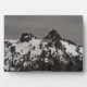 A black and white photograph of two peaks in the Tatoosh Range known as The Castle and The Pinnacle. The mountain range is covered in snow despite it being summer. There are trees and stone scattered about the landscape and mountains. The sun's position allows for shadows to be cast on the mountain. Incognito clouds grace the sky. Image Copyright ©2023 Kimberly J Tilley. zazzle.com/store/developingnature