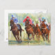 The leading horses round the bend in a thrilling National Hunt race, hooves pounding on the mud.