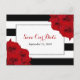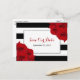 The chic modern luxe wedding collection features a classic black and white stripe background accentuated with beautiful ruby red roses and a faux silver foil frame.