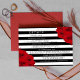 The chic modern luxe wedding collection features a classic black and white stripe background accentuated with beautiful ruby red roses.