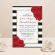 The chic modern luxe wedding collection features a classic black and white stripe background accentuated with beautiful ruby red roses and a faux gold foil frame.