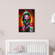 A skull with a green Christmas beanie on a red, yellow, green background and Christmas present in front of the skull. This is a AI generated art.