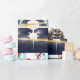 This design features a white and blue snowflake, a golden tree, coloured snowflakes and lots of snowmen dressed for a cold Christmas season. A navy backround and navy border was added. A tiled snowman was added to the backdrop. This Christmas wrapping paper is available in assorted styles, colours and sizes.