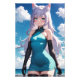 A captivating cat-eared figure with flowing silver locks and expressive blue eyes. Her modern teal dress and dark gloves offer a sleek contrast against the dynamic sky, ideal for art prints and apparel.