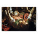 This card features a classical painting by famed artist Caravaggio. It was painted in the early 1600s. The title of the painting is "The Conversion of Saul." It depict a handsome, muscular young soldier on the ground, surrounded by men and horses.
