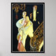 J. C. Leyendecker 1932 painting of a glamourous couple walking down a grand staircase dressed to the nines in evening attire.