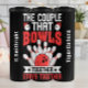 This graphic features a red bowling ball and five pins, with a distressed, grungy texture. The design includes the witty text 'THE COUPLE THAT BOWLS TOGETHER STAYS TOGETHER,' creating a simple and fun graphic for a perfect for a couple who loves to bowl together.