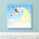 A whimsical depiction of the classic children’s nursery rhyme: Hey Diddle Diddle, "The Cow Jumped Over the Moon" depicts a black and white cow jumping over a sleepy moon. The color palette is soft pastels paired with black and white accents and the edge color is sky blue. and is perfect for a nursery or toddler’s room. This design pairs nicely with the "The Cat and the Fiddle," and they can be hung side by side or vertically. "The Cow Jumped Over the Moon" is a reproduction of an original painting by artist Glennis McClellan.